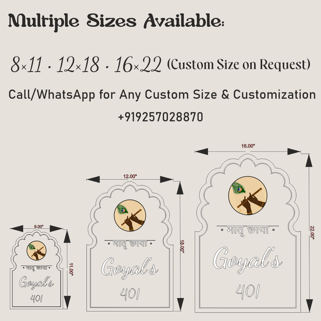 This nameplate features a beautiful Krishna flute silhouette with peacock feather art, making it ideal for families who love traditional yet modern decor.