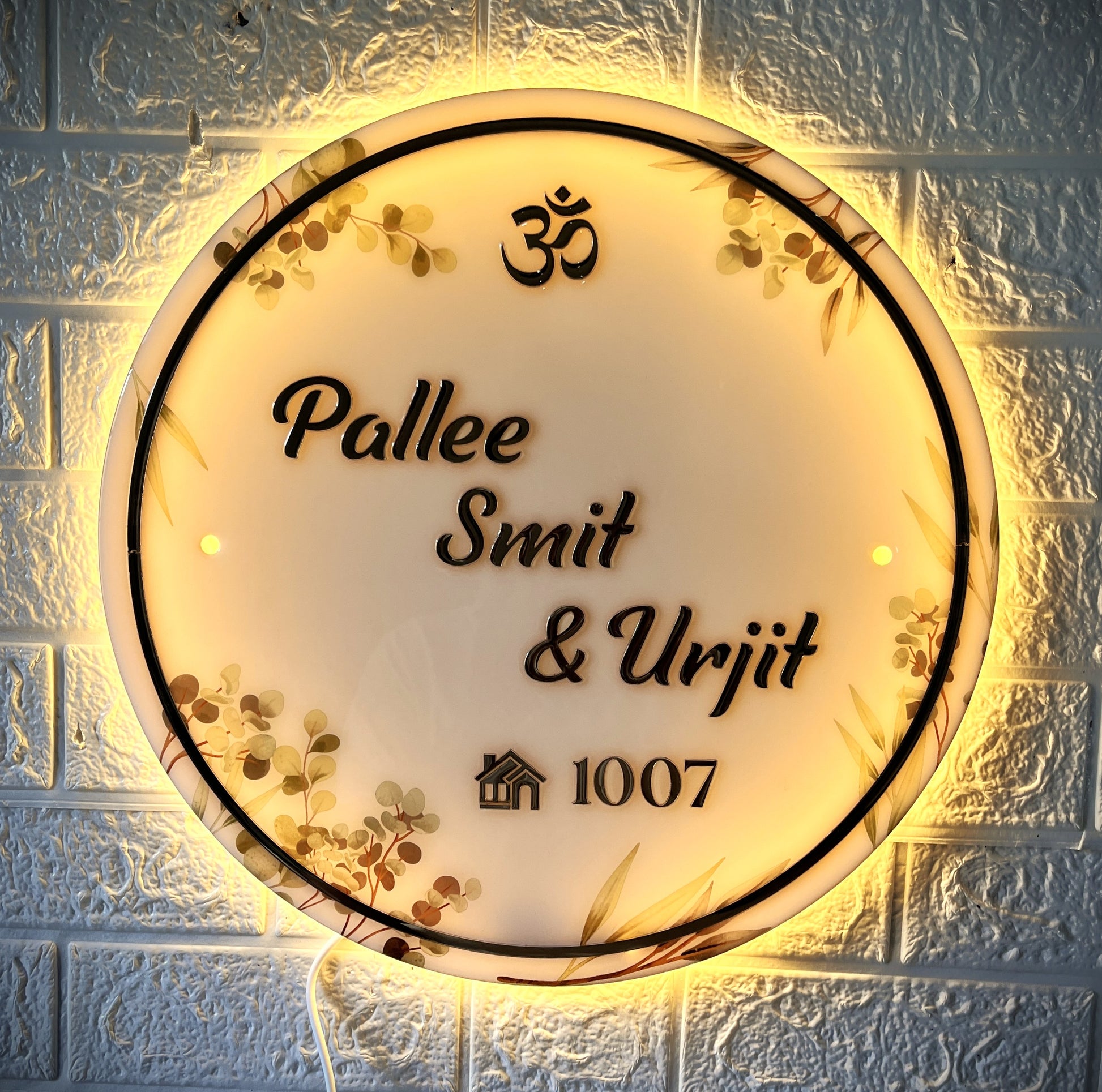 Round Warm LED Acrylic Nameplate with Resin Gloss Coating | 3D Black Letters | Floral Border Design | Custom Name & House Number Plate for Home